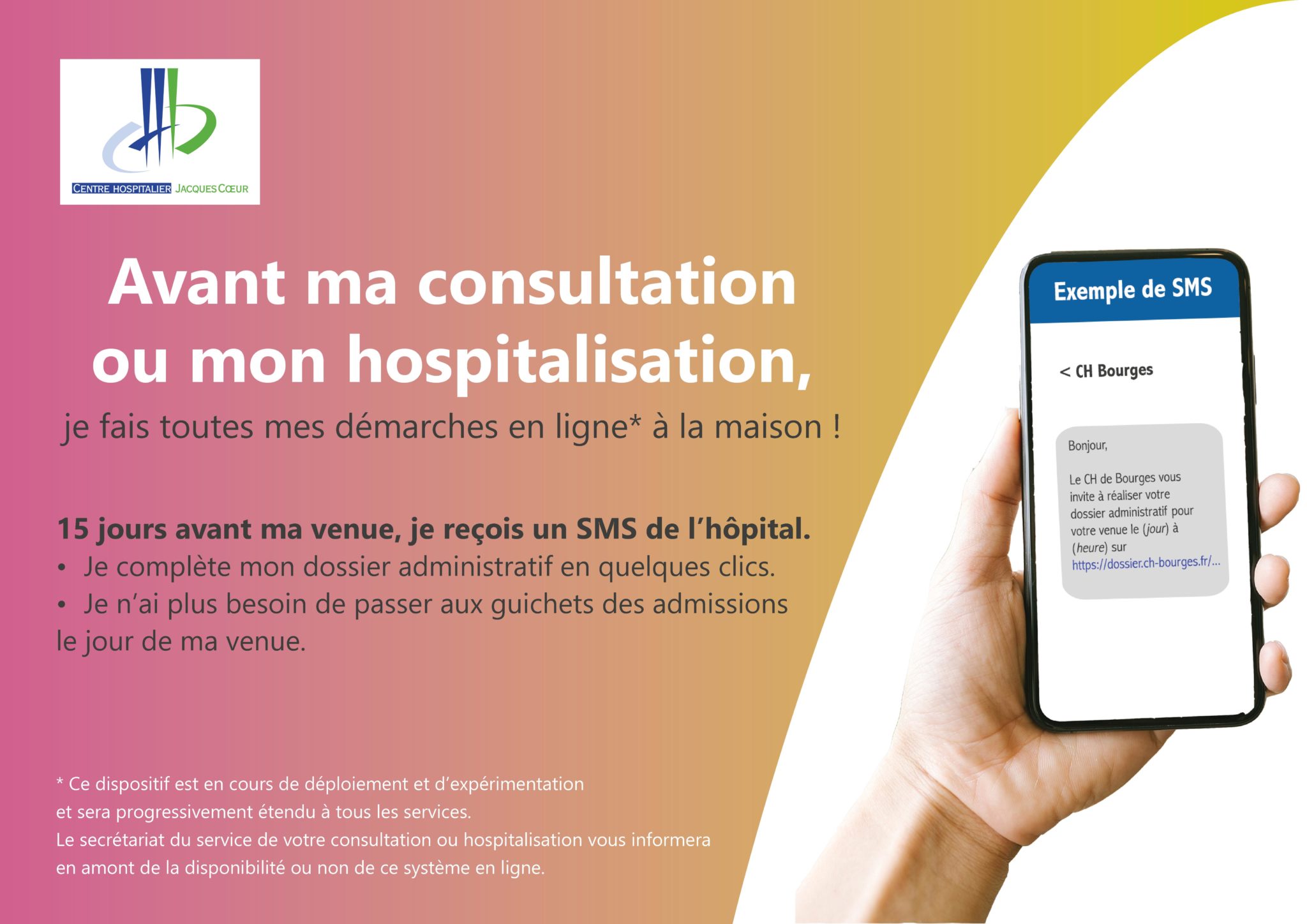 Pour faciliter votre parcours, le Centre Hospitalier Jacques Cœur expérimente un système vous permettant d'effectuer toutes vos démarches administratives avant votre arrivée à l'hôpital, que ce soit pour une consultation ou une hospitalisation. 15 jours avant votre venue à l’hôpital (avec une relance 7 jours avant), si le service qui vous accueille est dans le périmètre de l’expérimentation, vous recevrez un SMS au nom du Centre Hospitalier Jacques Cœur. Dans ce message figure un lien vers un formulaire pour effectuer vos démarches administratives.Vos informations personnelles seront déjà pré-remplies sur le formulaire. Vous n’aurez alors qu’à vérifier l’exactitude des données et transmettre les copies des documents demandés.Une fois ces informations renseignées, les professionnels du Bureau des Consultations et des Hospitalisations (BCH) s’assurent que toutes les données sont correctes. Si tel est le cas, alors vous recevrez un mail de confirmation et vous n’aurez pas besoin de passer aux guichets des admissions le jour de votre venue à l’hôpital.S’il manque des informations, vous recevrez un mail pour vous inviter à compléter les éléments manquants.Ce système permet de faciliter votre parcours et de réduire le temps d’attente au niveau des guichets des admissions.Si vous n’effectuez pas vos démarches administratives en ligne, les guichets des admissions vous resteront accessibles. Les services concernés par ce systèmeCardiologieChirurgie ambulatoireEndocrinologieGastro-entérologieHématologie clinique et oncologie médicaleMédecine infectieuseMédecine interneNéphrologieNeurologiePneumologieRhumatologieUrologieEn 2026, l’établissement étendra progressivement ce dispositif dans tous les services.