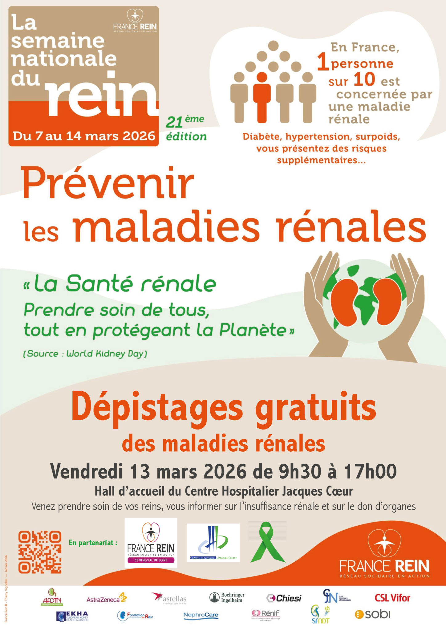 13 mars 2026 Partage agenda Centre Hospitalier Jacques Coeur - Hall d'accueil Localiser Le vendredi 13 mars 2026, de 9h30 à 17h00, le Centre Hospitalier Jacques Cœur, en partenariat avec l'association France Rein, réseau solidaire en action, organise dans son hall d'accueil des dépistages gratuits des maladies rénales. Cette action s’inscrit dans le cadre de la journée du rein. L’objectif de cette journée est de sensibiliser le grand public aux maladies rénales, dont les symptômes ne sont perceptibles qu’à un stade avancé de la maladie. Or, plus une maladie rénale est identifiée tôt, plus les chances d’agir efficacement contre cette dernière sont élevées. A ce jour, 1 personne sur 20 a une maladie rénale sans le savoir ! Le dépistage est le seul outil qui permet d’identifier une maladie rénale, d’où l’importance de le réaliser. Le dépistage d’une maladie rénale est indolore et très rapide, puisqu’il s’effectue par une prise de tension et un test urinaire. Les résultats des dépistages sont donnés sur place, après analyse par les équipes de néphrologie-hémodialyse. Lors de cette journée, vous pourrez également vous informer sur le don d’organes pour ensuite exprimer votre choix auprès de vos proches. Retour à la liste des événements A lireaussi 13/03/2026 Les 24h du recrutement Ajouter cet événement à votre agenda × Pour ajouter cet événement à votre agenda, merci d'ouvrir le fichier qui vient d'être téléchargé.