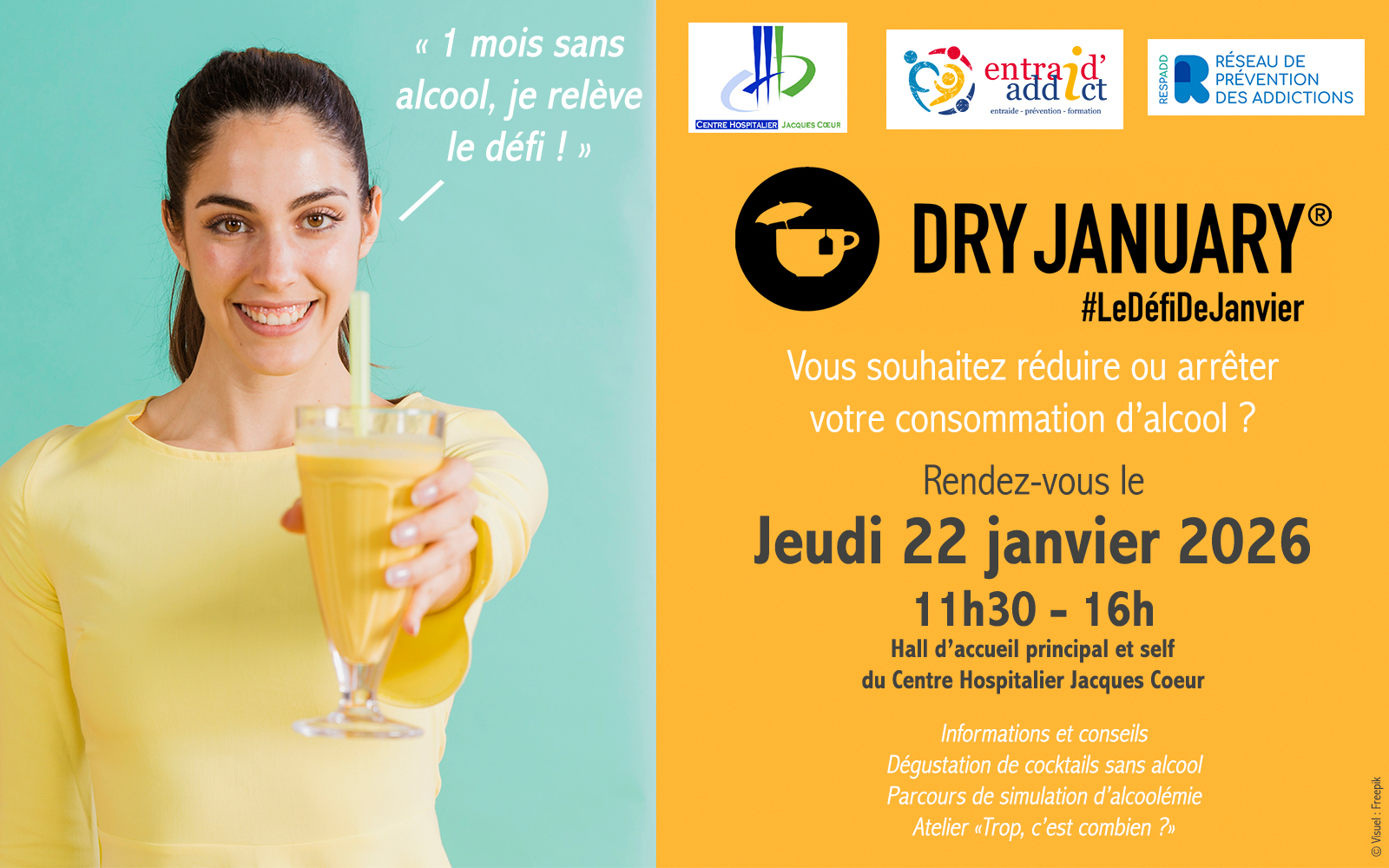 22 janvier 2026 Partage agenda Centre Hospitalier Jacques Coeur Localiser Vous souhaitez réduire ou arrêter votre consommation d'alcool ? Vous souhaitez vous lancer le défi de ne boire aucune goutte d'alcool pendant un mois ? Alors rendez-vous le jeudi 22 janvier de 11h30 à 16h00 da,s me hall d'accueil principal et le self de l'hôpital. Au programme : Informations et conseilsDégustation de cocktails sans alcoolParcours de simulation d’alcoolémieAtelier “Trop, c’est combien ?” Retour à la liste des événements A lireaussi 07/02/2026 Portes ouvertes de l’IFAS-IFA de Bourges (2026) Ajouter cet événement à votre agenda × Pour ajouter cet événement à votre agenda, merci d'ouvrir le fichier qui vient d'être téléchargé.