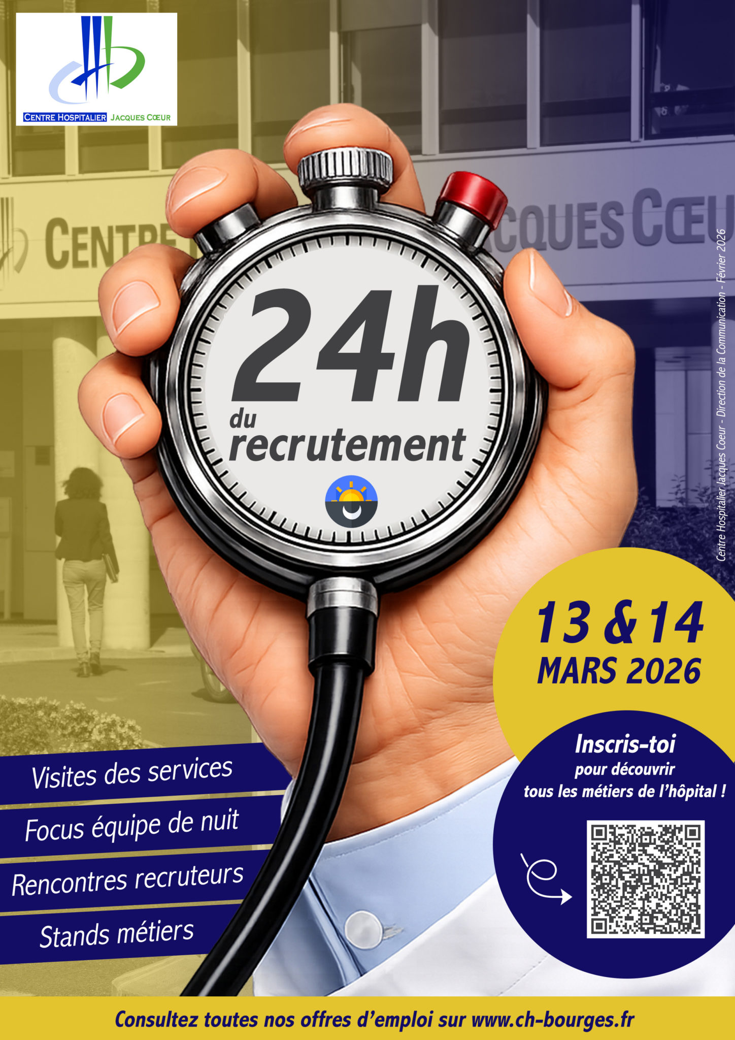 13 mars 2026 Partage agenda Centre Hospitalier Jacques Coeur Localiser Vendredi 13 et samedi 14 mars 2026, participez aux 24h du recrutement du Centre Hospitalier Jacques Cœur. Cet événement est ouvert pour tous les métiers de l'hôpital. Alors que vous soyez soignant ou pas, venez découvrir notre établissement et nos offres d'emploi. Au programme des 24h du recrutement : Vendredi 13 mars 202613h30 : Accueil Café14h00 et 15h00 : Visite des services, stands métiers et découverte des pôles, rencontre avec les recruteurs20h00 : Présentation de l’établissement et du travail de nuit, visite des services et rencontre avec les recruteurs autour d’un apéro convivialSamedi 14 mars 202609h30 : Accueil Petit-Déjeuner10h00 et 11h00 : Visite des services, stands métiers et découverte des pôles, rencontre avec les recruteursL’inscription à cet événement est obligatoire via ce formulaire : https://forms.office.com/Pages/ResponsePage.aspx?id=Q-hmw7wTNUqm9dy_5oSLqAKfP3ln_QNBvluE72OdN9RUQzg4Tkk4TTcxQlRXSE43VFk4V0JDU0xWSC4u Retour à la liste des événements A lireaussi 13/03/2026 Dépistages gratuits des maladies rénales Ajouter cet événement à votre agenda × Pour ajouter cet événement à votre agenda, merci d'ouvrir le fichier qui vient d'être téléchargé.